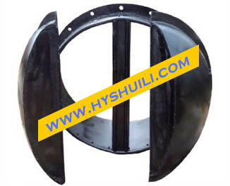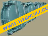 節(jié)能型側(cè)翻式拍門運(yùn)行中的兩大關(guān)鍵點(diǎn)是:止水密封功能和啟閉靈活度。拍門的止水裝置為結(jié)構(gòu)型門葉,密封裝置為橡膠;門葉必須具有均勻的受力設(shè)計(jì)(如:弧度、扇形加強(qiáng)筋),而密封橡膠中以丁晴橡膠最為理想,具有耐沖擊、抗老化和耐腐蝕的功能。